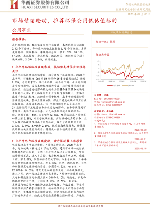 【华西证券】【20200719】公用事业行业研究周报:环保板块自七月来表现亮眼,持续推荐低估值标的-19页 行业研究