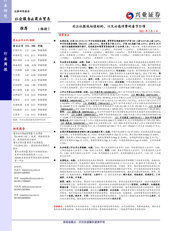 【兴业证券】【20210201】社会服务&商业贸易行业周报:关注社服低估值标的,以及必选消费的春节行情-21页 行业研究