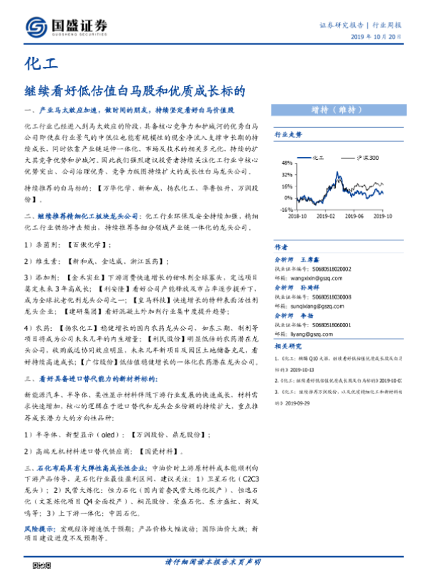 【国盛证券】【20191020】20191020-国盛证券-化工行业周报:继续看好低估值白马股和优质成长标的-6页 行业研究