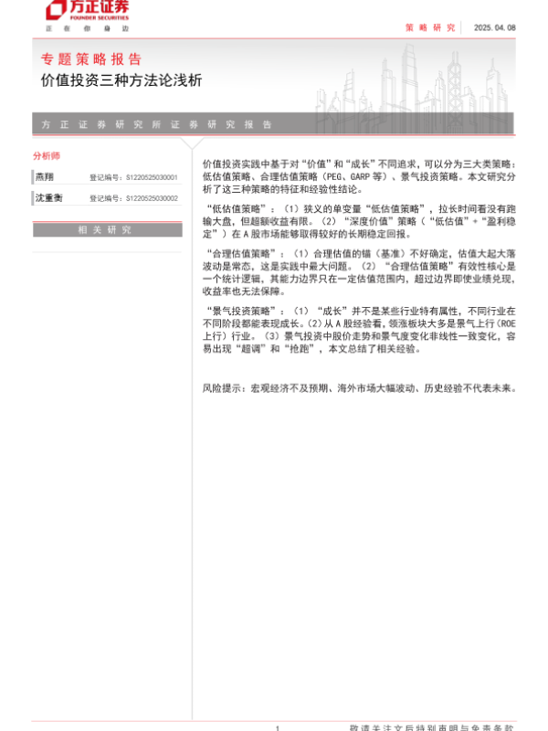 【方正证券】【20250408】专题策略报告:价值投资三种方法论浅析-20页 证券期货研究报告