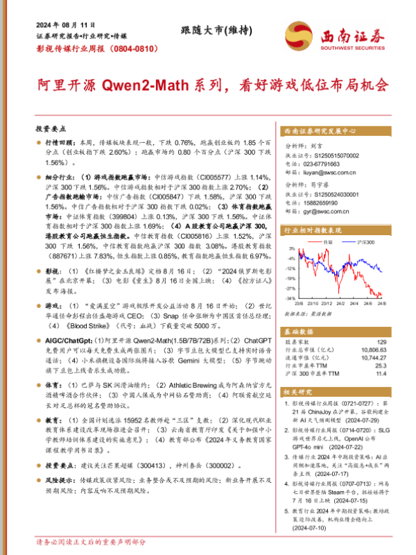 【西南证券】【20240811】阿里开源Qwen2-Math系列,看好游戏低位布局机会-19页 行业研究