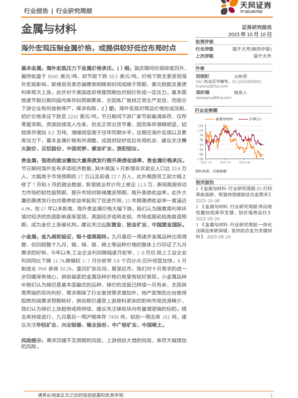【天风证券】【20231010】金属与材料行业研究周报:海外宏观压制金属价格,或提供较好低位布局时点-15页 行业研究