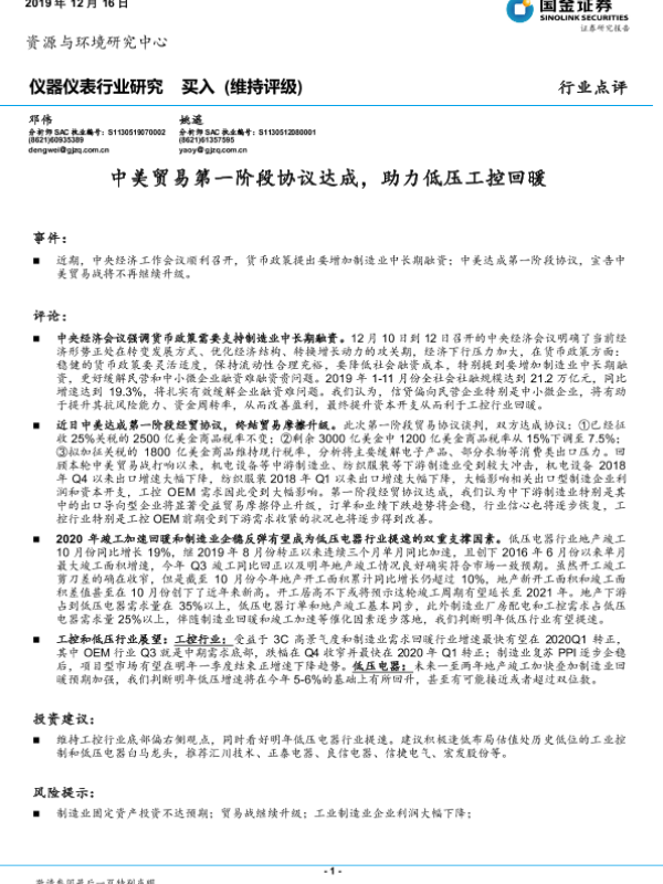 【国金证券】【20191216】仪器仪表行业研究:中美贸易第一阶段协议达成,助力低压工控回暖-6页 行业研究