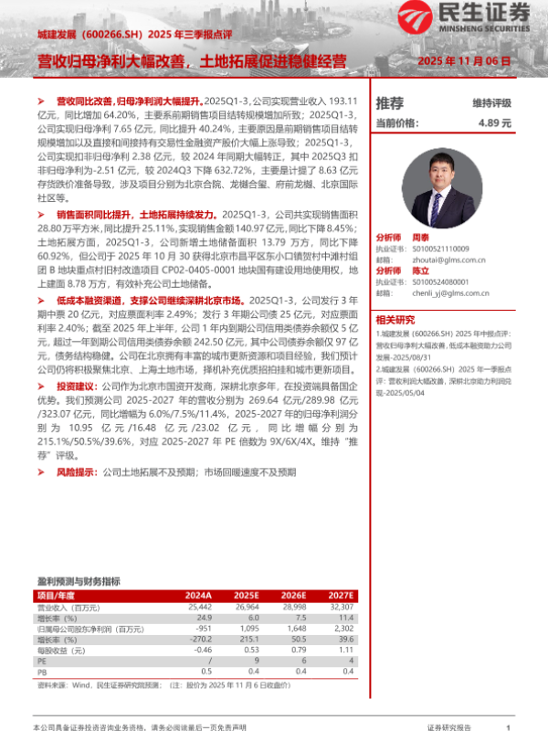 【民生证券】【202511】城建发展(600266.SH)2025年三季报点评:营收归母净利大幅改善,土地拓展促进稳健经营-3页 证券期货研究报告
