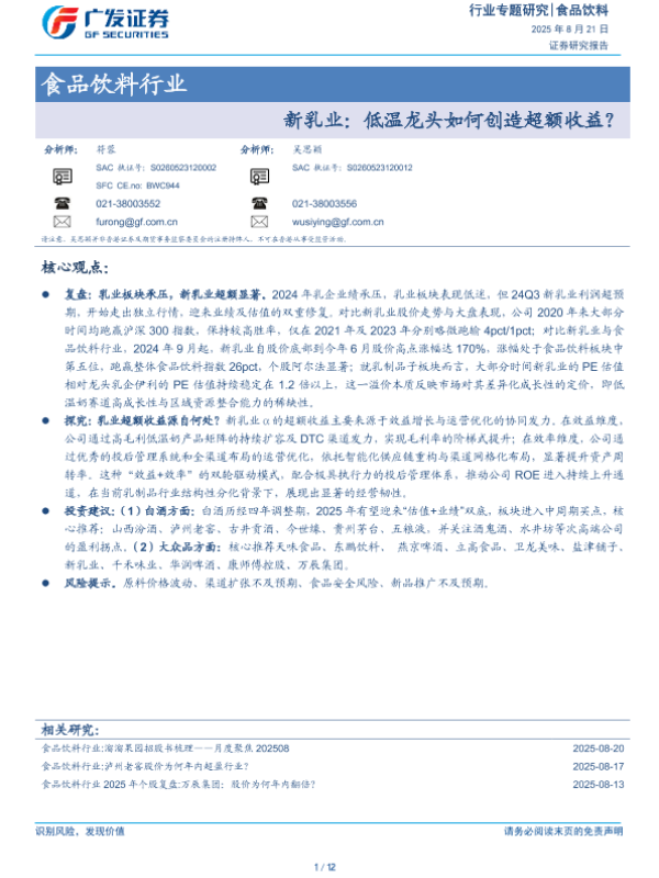 【广发证券】【202508】食品饮料行业:新乳业,低温龙头如何创造超额收益?-12页 证券期货研究报告