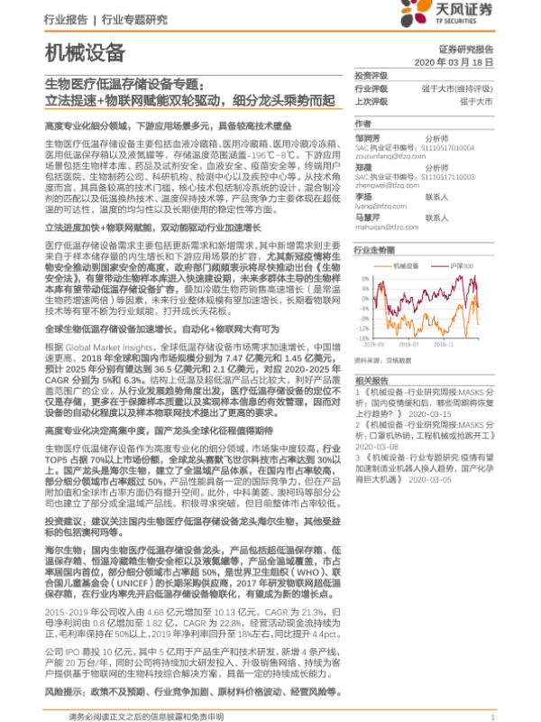 【天风证券】【20200318】生物医疗低温存储设备专题:立法提速+物联网赋能双轮驱动,细分龙头乘势而起-20页 行业研究