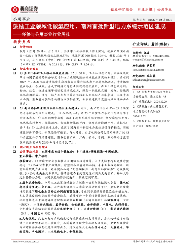 【浙商证券】【20250105】环保与公用事业行业周报:鼓励工业领域低碳氢应用,南网首批新型电力系统示范区建成-15页 行业研究