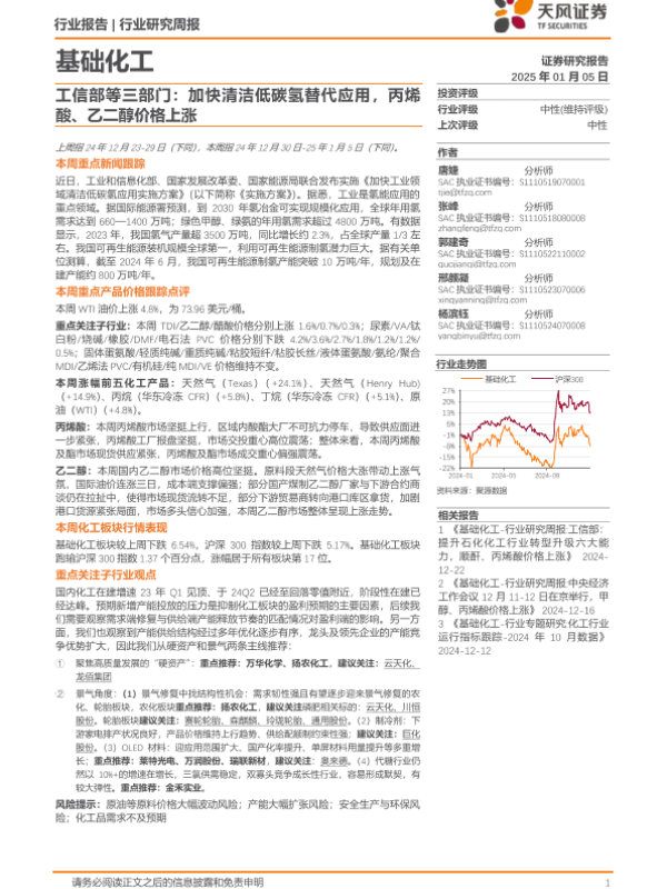 【天风证券】【20250105】基础化工行业工信部等三部门:加快清洁低碳氢替代应用,丙烯酸、乙二醇价格上涨-21页 行业研究