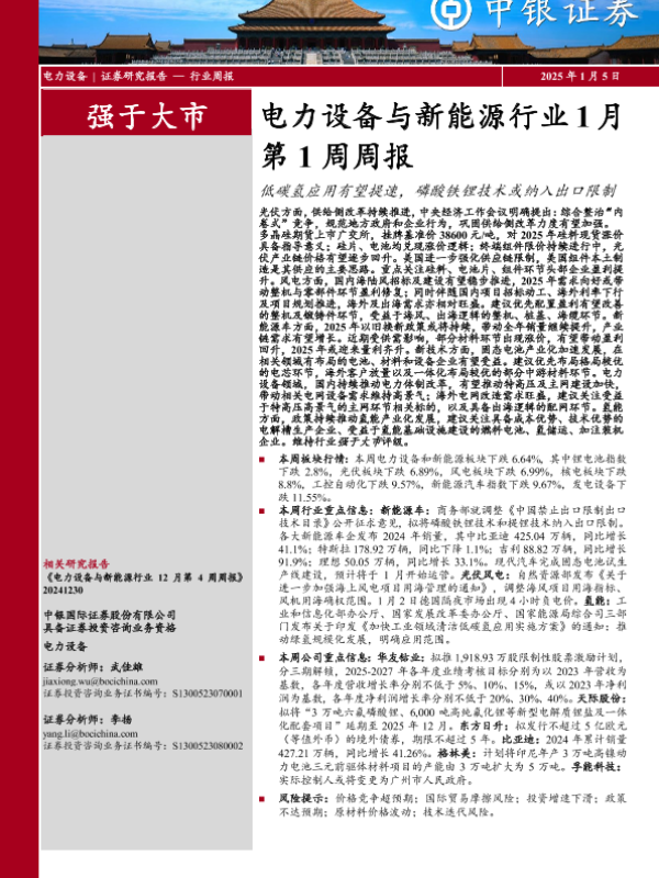 【中银证券】【20250105】电力设备与新能源行业1月第1周周报:低碳氢应用有望提速,磷酸铁锂技术或纳入出口限制-11页 行业研究