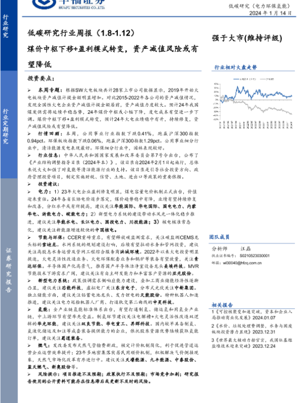 【华福证券】【20240114】低碳研究行业周报:煤价中枢下移+盈利模式转变,资产减值风险或有望降低-16页 行业研究