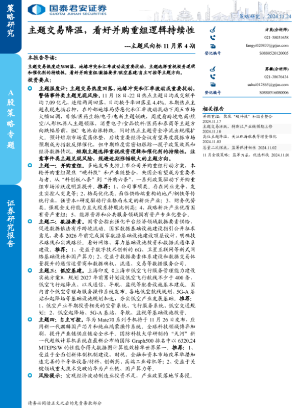 【国泰君安证券】【20241124】主题风向标11月第4期:主题交易降温,看好并购重组逻辑持续性-17页 行业研究