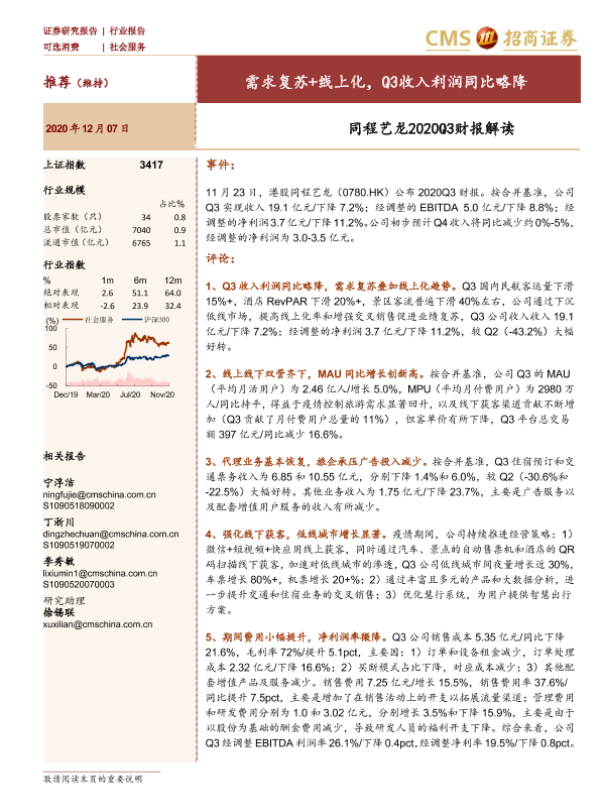 【海通证券】【20201207】社会服务:同程艺龙2020Q3财报解读-需求复苏+线上化,Q3收入利润同比略降-4页 财报