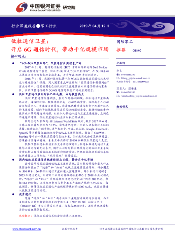 【银河证券】【20190412】低轨通信卫星:开启6G通信时代,带动千亿规模市场-29页 行业研究
