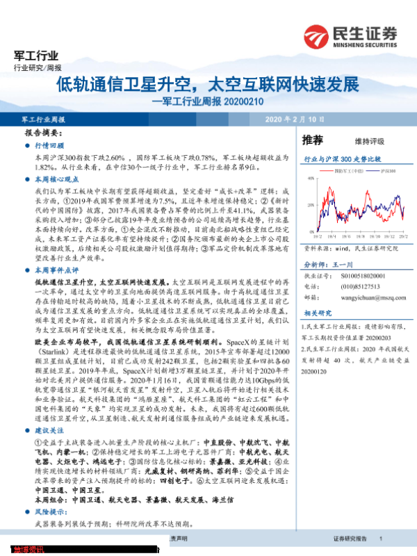 【民生证券】【20200210】20200210-民生证券-军工行业周报:低轨通信卫星升空,太空互联网快速发展-40页 行业研究