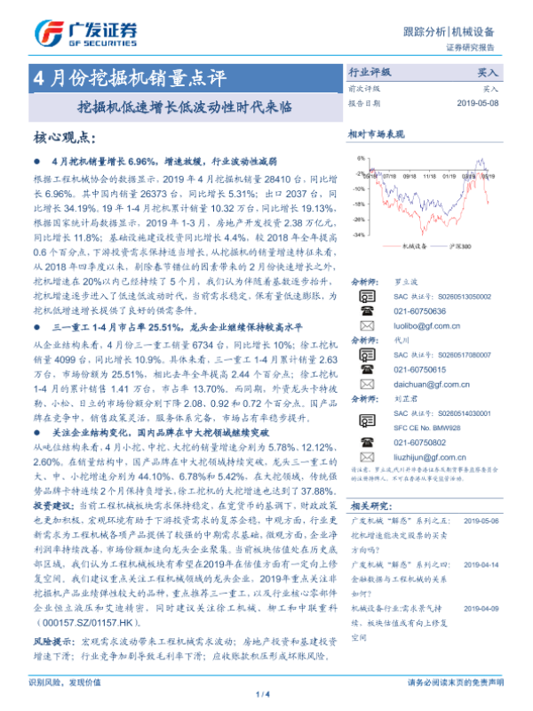 【广发证券】【20190508】4月份挖掘机销量点评:挖掘机低速增长低波动性时代来临-4页 行业研究