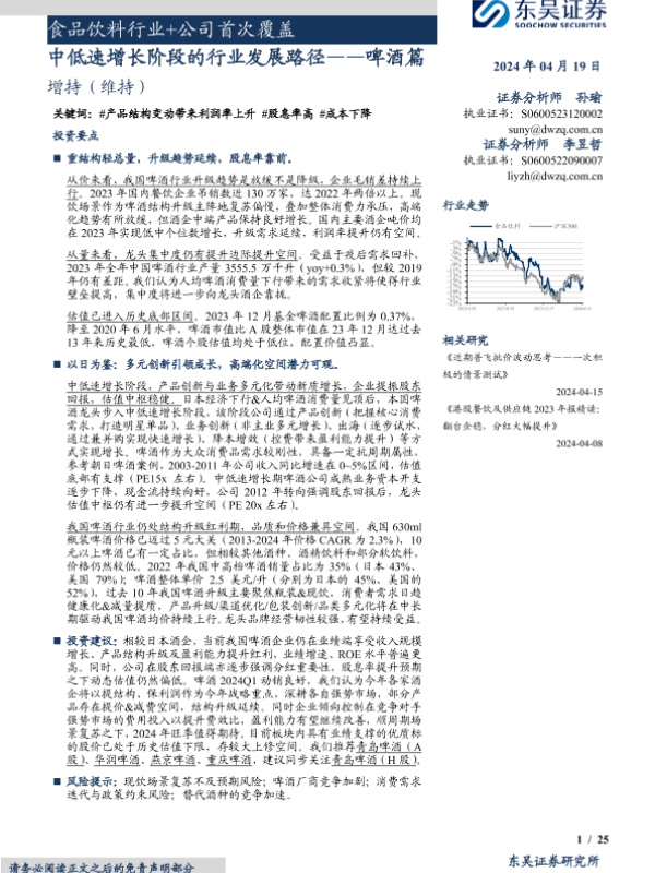 【东吴证券】【20240419】食品饮料行业+公司首次覆盖:中低速增长阶段的行业发展路径,啤酒篇-34页 行业研究