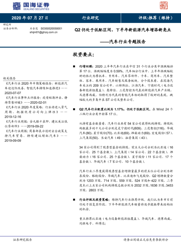 【国海证券】【20200727】Q2仍处于低配区间,下半年新能源汽车增添新亮点——汽车行业专题报告-13页 行业研究