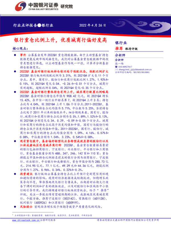 【银河证券】【20220426】银行业:银行重仓比例上升,优质城商行偏好度高-5页 行业研究