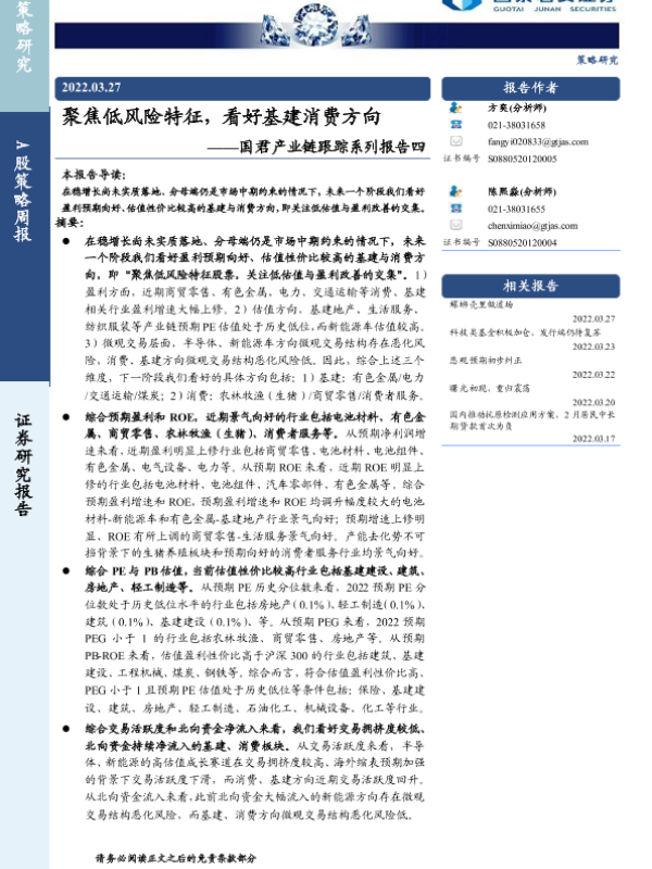 【国泰君安证券】【20220327】聚焦低风险特征,看好基建消费方向-16页 行业研究