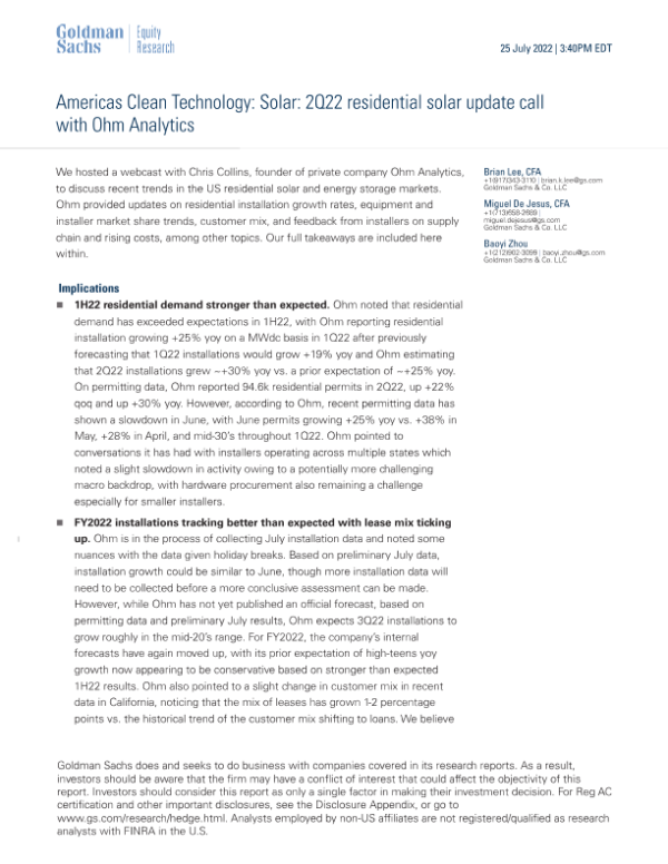 【Goldman Sachs】【20220725】2Q22住宅太阳能更新电话会议与Ohm Analytics-6页 行业研究