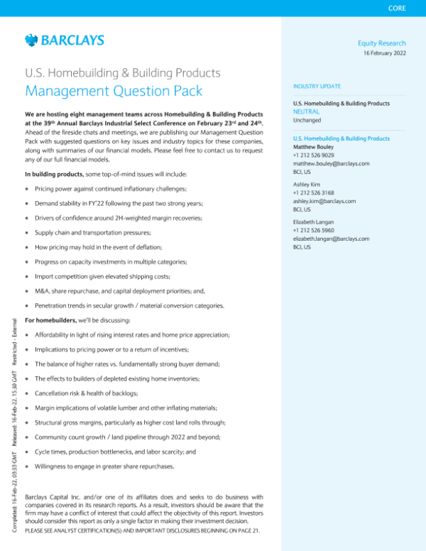 【Barclays Capital Inc.】【20220216】U.S. Homebuilding & Building Products Management Question Pack-28页 行业研究