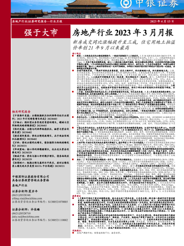 【中银证券】【20230413】房地产行业2023年3月月报:新房成交同比涨幅提升至三成,住宅用地土拍溢价率创21年9月以来最高-26页 行业研究