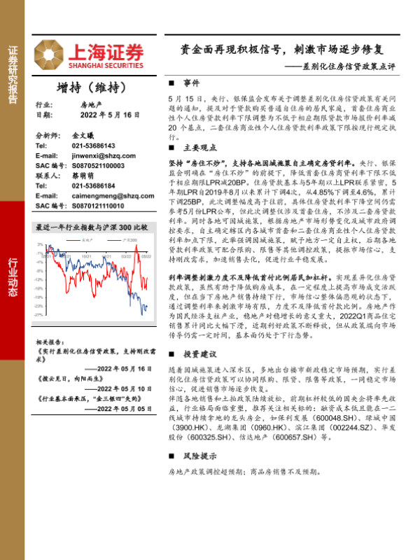 【上海证券】【20220516】差别化住房信贷政策点评:资金面再现积极信号,刺激市场逐步修复-2页 行业研究
