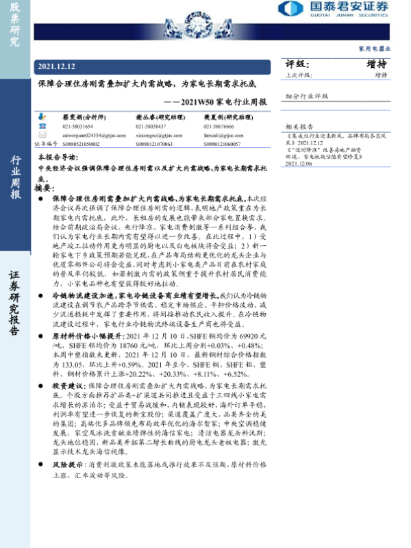 【国泰君安证券】【20211212】2021W50家电行业周报:保障合理住房刚需叠加扩大内需战略,为家电长期需求托底-10页 行业研究
