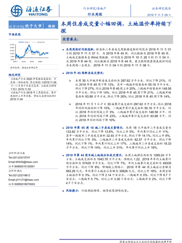 【海通证券】【20191109】房地产行业周报:本周住房成交量小幅回调,土地溢价率持续下探-6页 行业研究