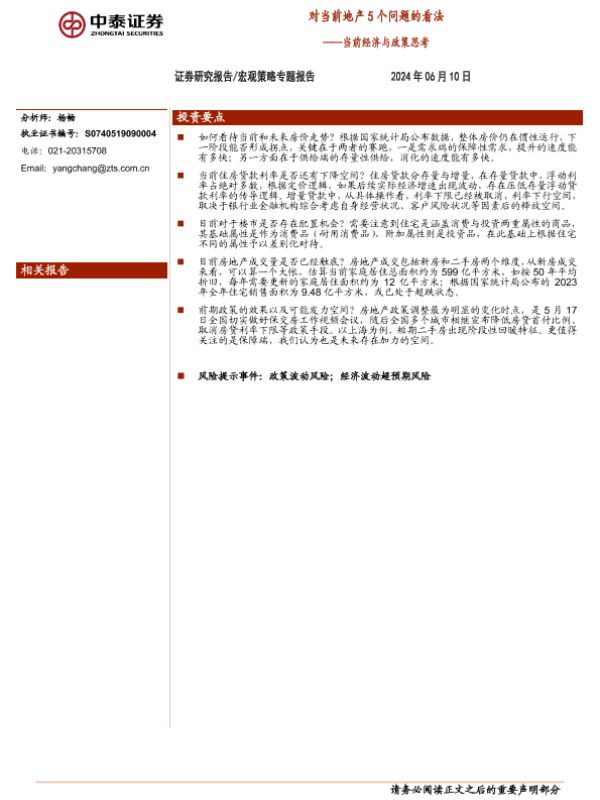 【中泰证券】【20240610】宏观策略专题报告:对当前地产5个问题的看法,当前经济与政策思考-11页 行业研究