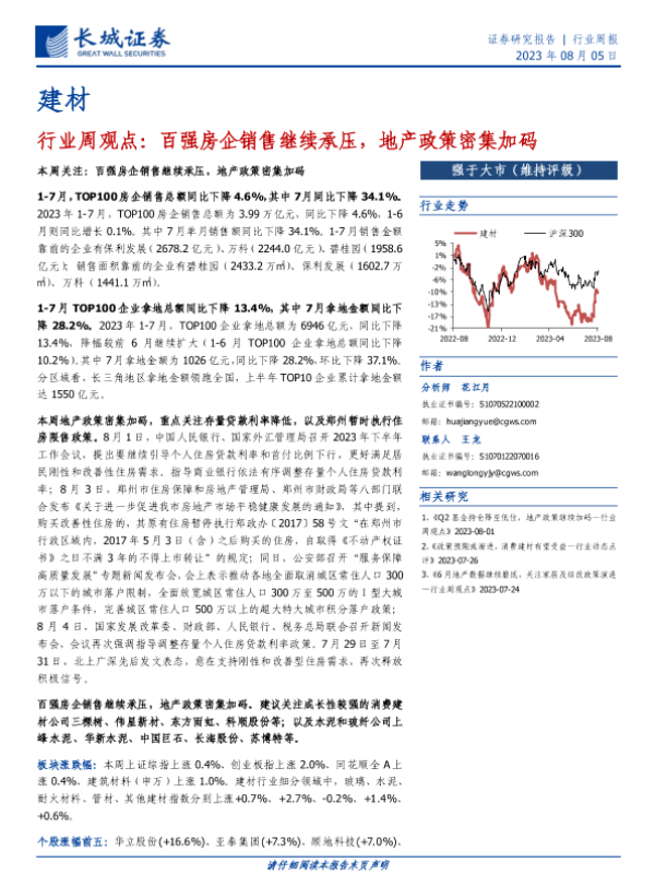 【长城证券】【20230805】建材行业周观点:百强房企销售继续承压,地产政策密集加码-16页 行业研究