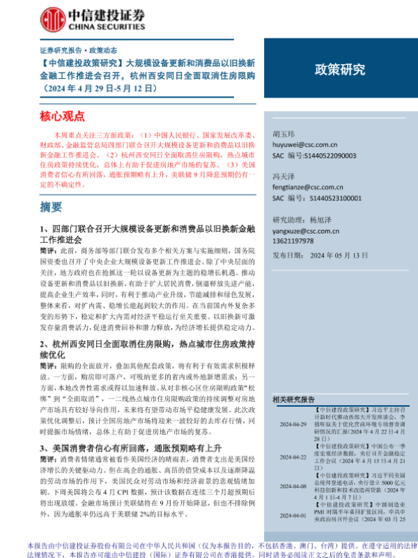 【中信建投证券】【20240513】大规模设备更新和消费品以旧换新金融工作推进会召开,杭州西安同日全面取消住房限购-18页 行业研究