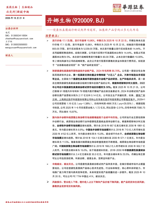 【华源证券】【202510】丹娜生物(920009.BJ)——侵袭性真菌病诊断试剂单项冠军,拓展新产品管线以多元化布局-19页 证券期货研究报告