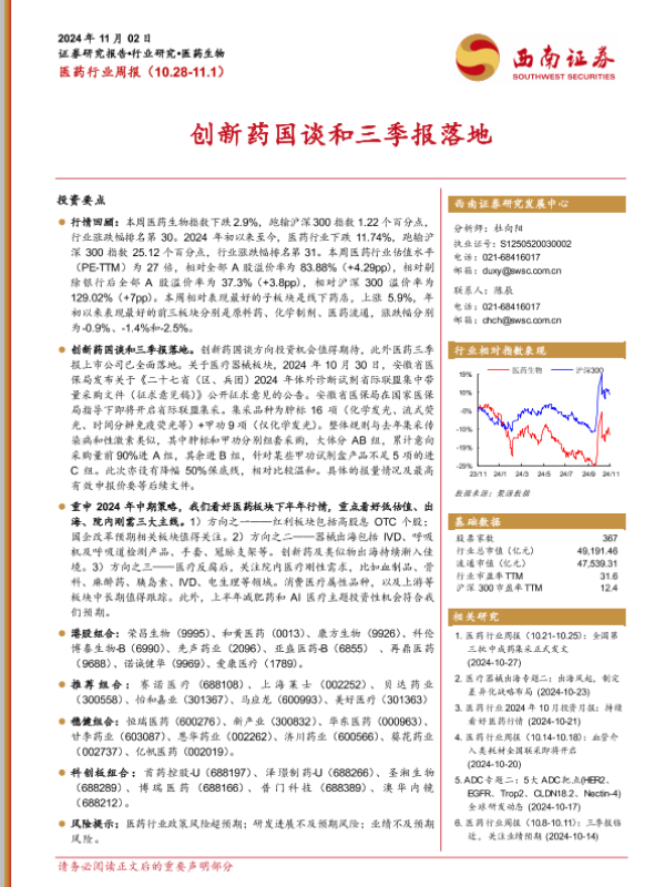 【西南证券】【20241102】医药行业周报:创新药国谈和三季报落地-34页 行业研究