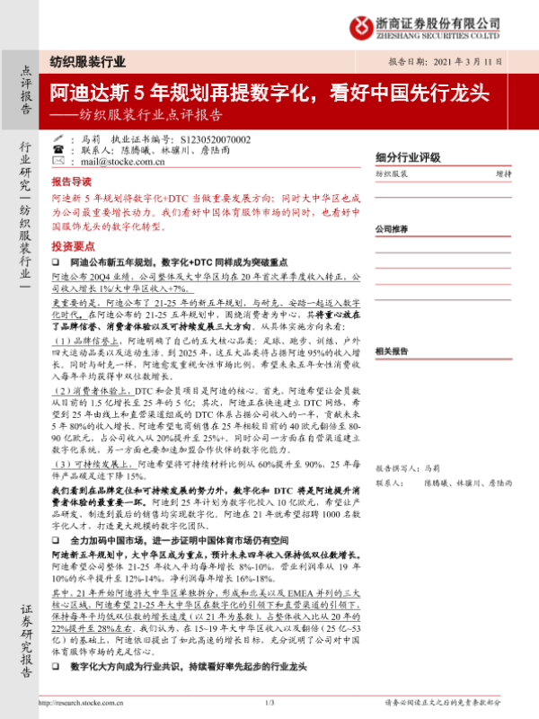 【浙商证券】【20210311】20210311-浙商证券-纺织服装行业点评报告:阿迪达斯5年规划再提数字化,看好中国先行龙头-3页 行业研究