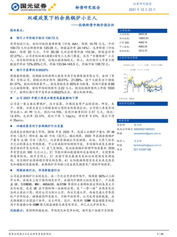 【国元证券】【20211223】杭锅转债申购价值分析:双碳政策下的余热锅炉小巨人-15页 行业研究