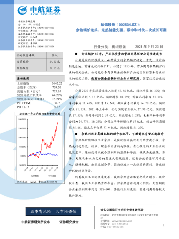【中航证券】【20210923】杭锅股份:余热锅炉龙头、光热储能先驱,碳中和时代二次成长可期-28页 公司研究