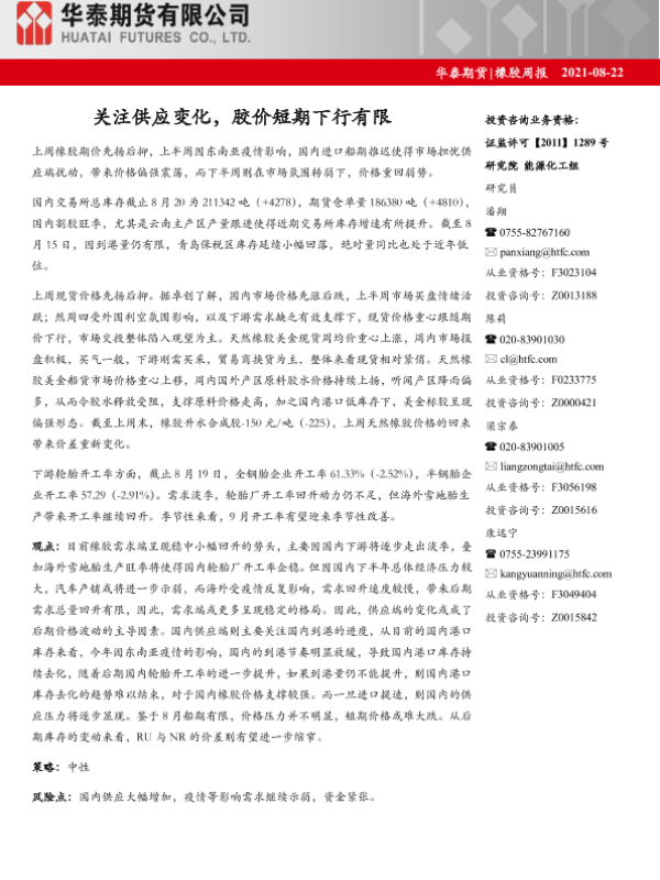 【华泰期货】【20210822】橡胶周报_关注供应变化_胶价短期下行有限-14页 行业研究