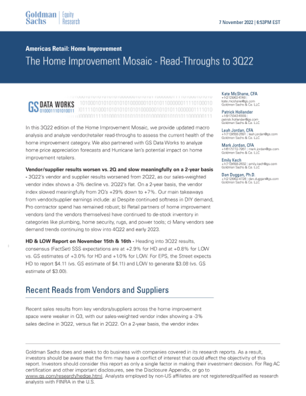【Goldman Sachs】【20221107】il_ Home Improvement_ The Home Improvement Mosaic - Read-Throughs to 3Q22-26页 行业研究