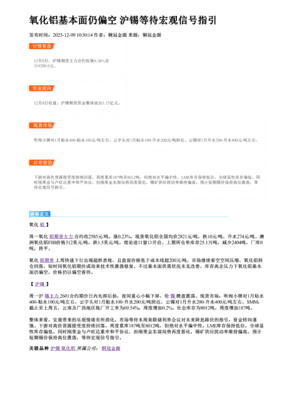 【铜冠金源期货】【202512】氧化铝基本面仍偏空 沪锡等待宏观信号指引-1页 证券期货研究报告