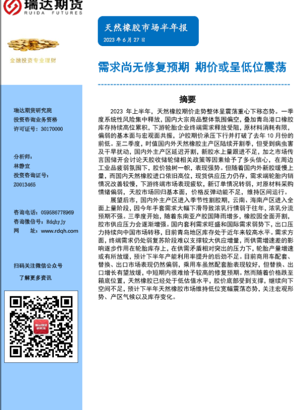 【瑞达期货】【20230627】天然橡胶市场半年报:需求尚无修复预期,期价或呈低位震荡-17页 行业研究