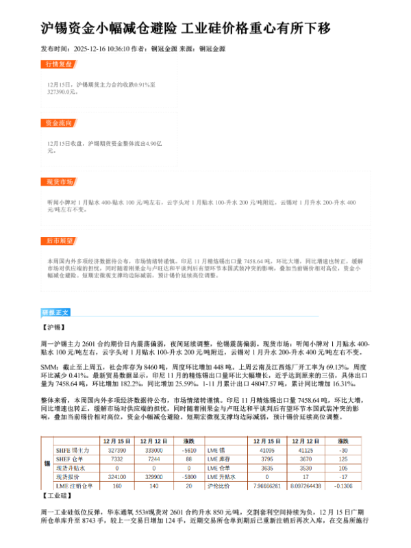 【铜冠金源期货】【202512】沪锡资金小幅减仓避险 工业硅价格重心有所下移-2页 证券期货研究报告