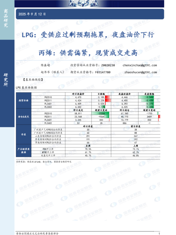 【国泰君安期货】【202509】LPG:受供应过剩预期拖累,夜盘油价下行 丙烯:供需偏紧,现货成交走高-4页 证券期货研究报告