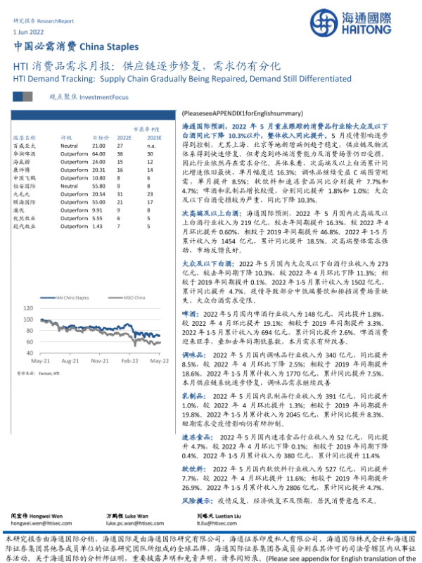 【海通国际】【20220601】中国必需消费:HTI消费品需求月报:供应链逐步修复,需求仍有分化-14页 行业研究