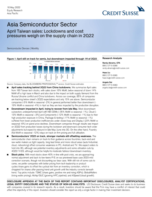 【瑞信】【20220516】亚太地区半导体行业-4月台湾地区销售情况:2022年第2季度封锁和成本压力对供应链构成压力-21页 行业研究