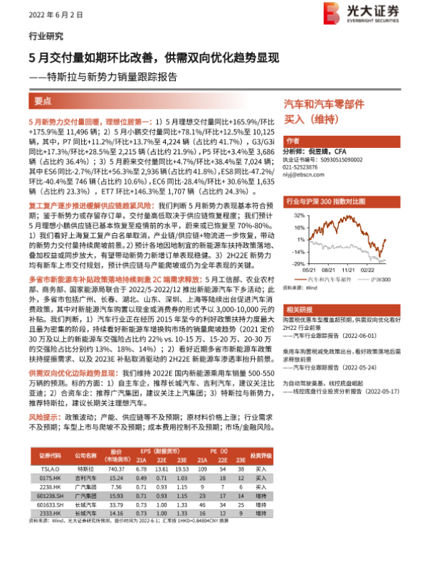 【光大证券】【20220602】汽车和汽车零部件:特斯拉与新势力销量跟踪报告-5月交付量如期环比改善,供需双向优化趋势显现-4页 行业研究