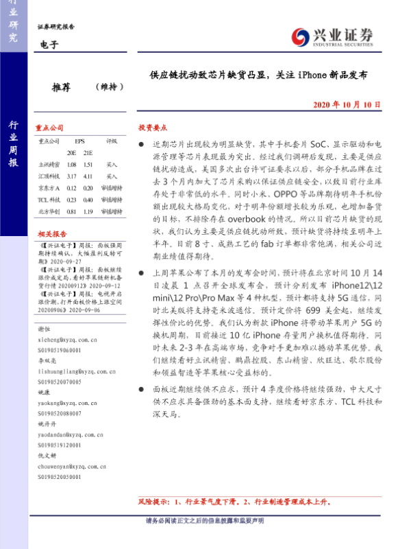 【兴业证券】【20201010】供应链扰动致芯片缺货凸显,关注 iPhone新品发布-8页 行业研究
