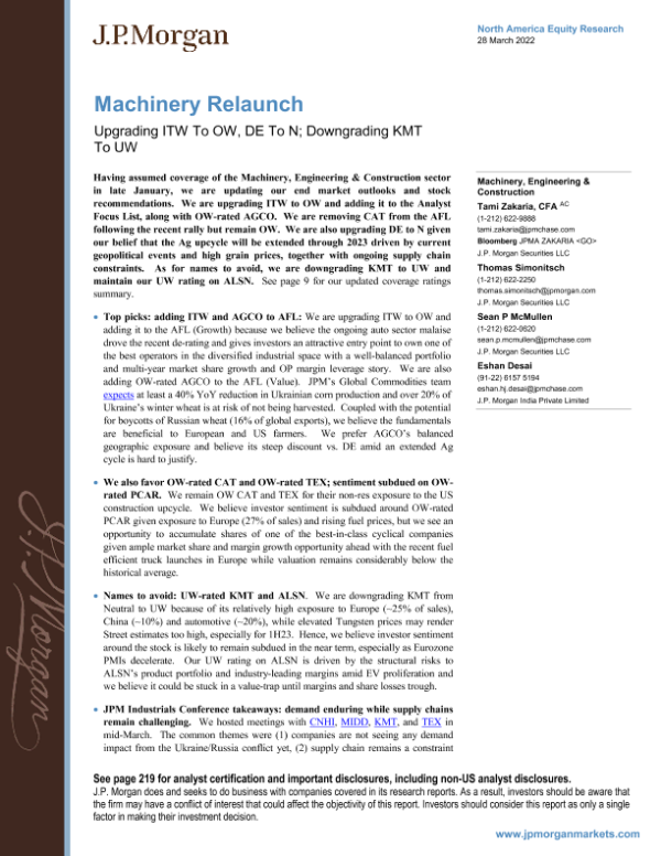 【J.P. Morgan】【20220328】Machinery Relaunch Upgrading ITW To OW, DE To N; Downgrading KMT To UW-223页 行业研究