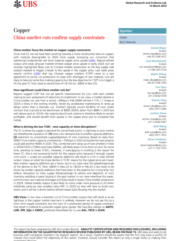 【UBS AG London Branch】【20240315】UBS Equities-Copper _China smelter cuts confirm supply constraints_-24页 行业研究