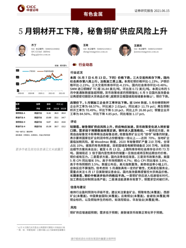 【中金公司】【20210615】20210615-中金公司-有色金属行业:5月铜材开工下降,秘鲁铜矿供应风险上升-22页 行业研究